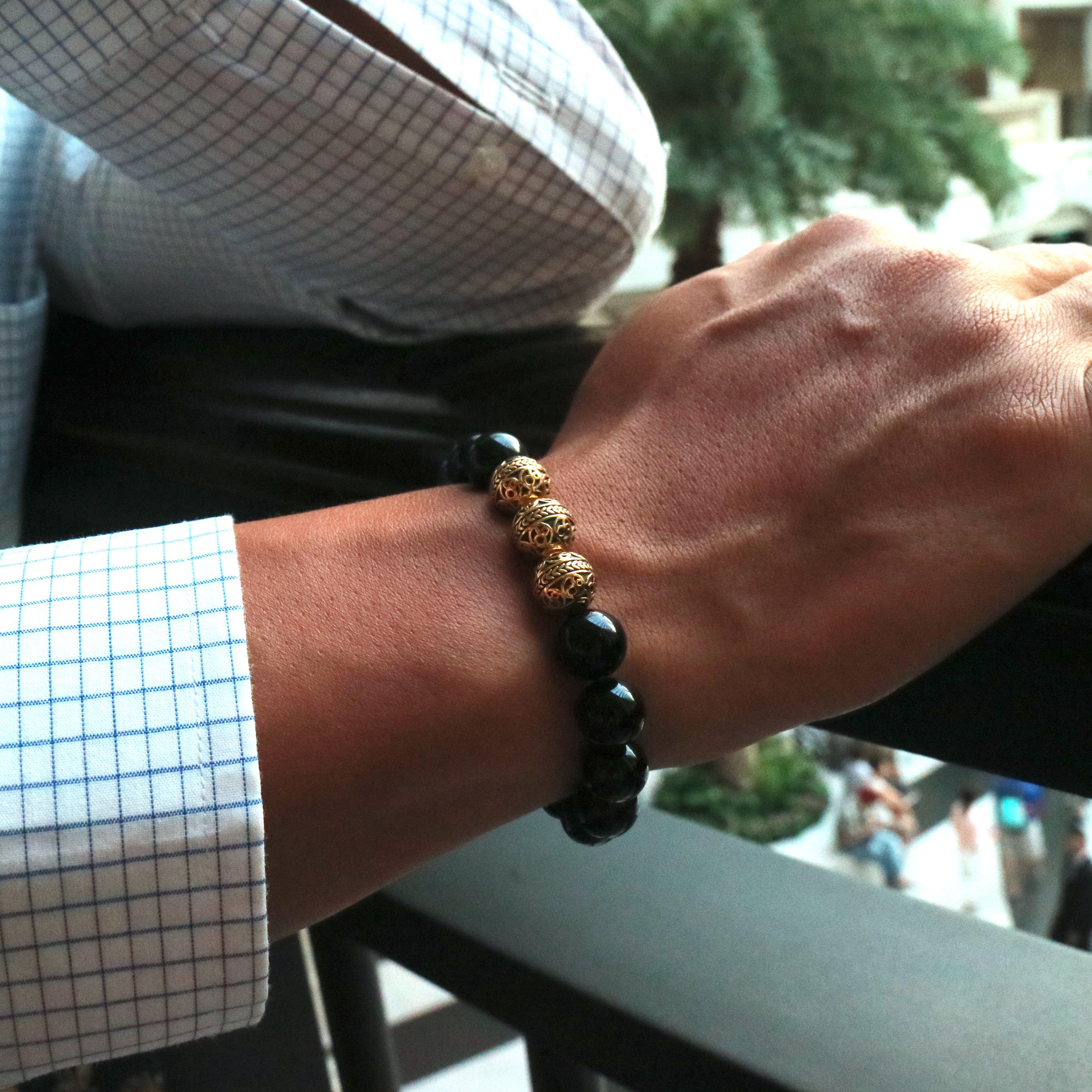 Highly valued by the Romans, the obsidian stone was fractured to produce blades and arrowheads. Azuro Republic's obsidian Bracelet for men with 24k gold plated beads, 3 microns in thickness, came to life for those who seek to shield themselves against bad luck and are surrounded by negative energies.