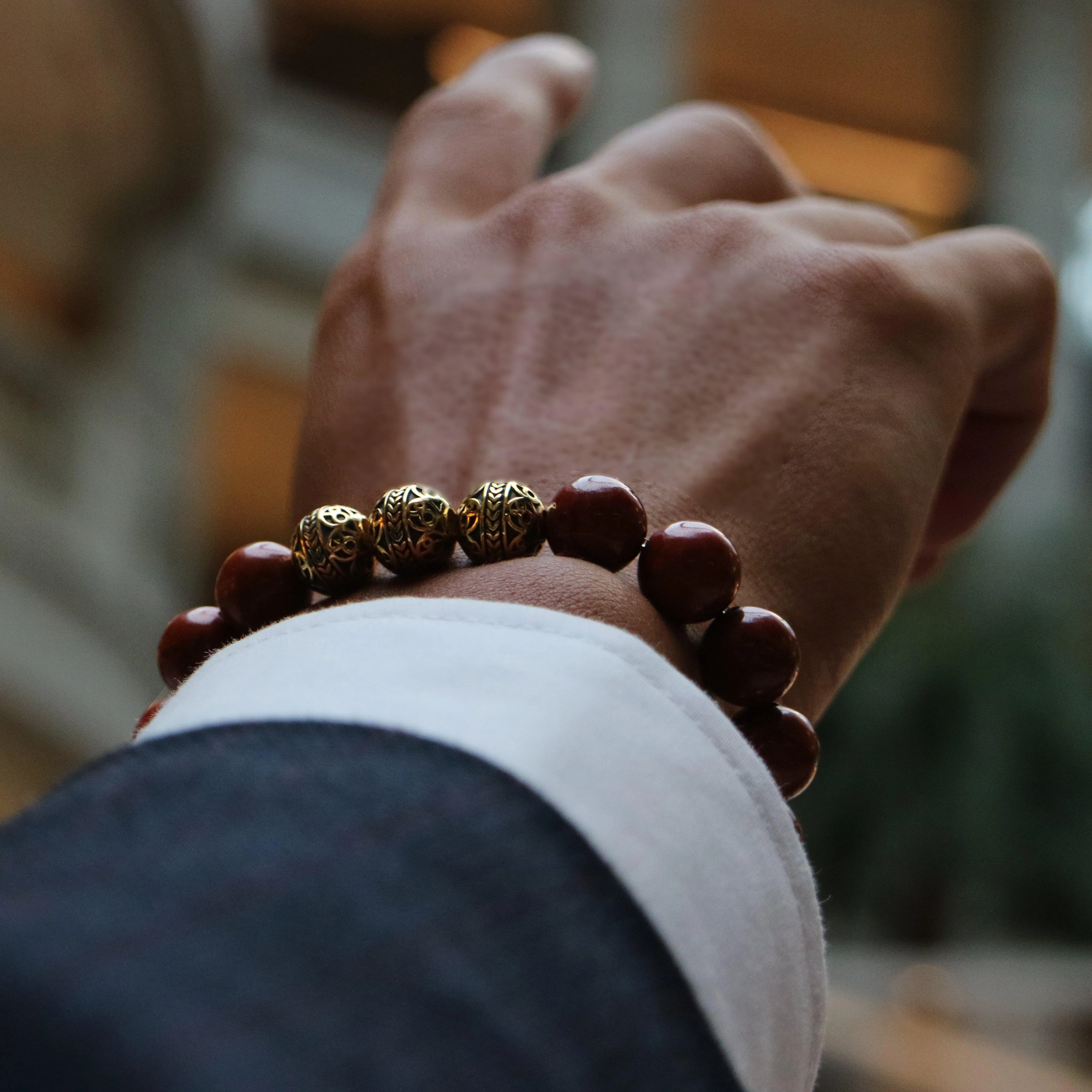 The red jasper bracelet with a 24k gold classic design has an opaque luster. We can custom your personal jasper bracelet from red-orange to brown-orange.Ā