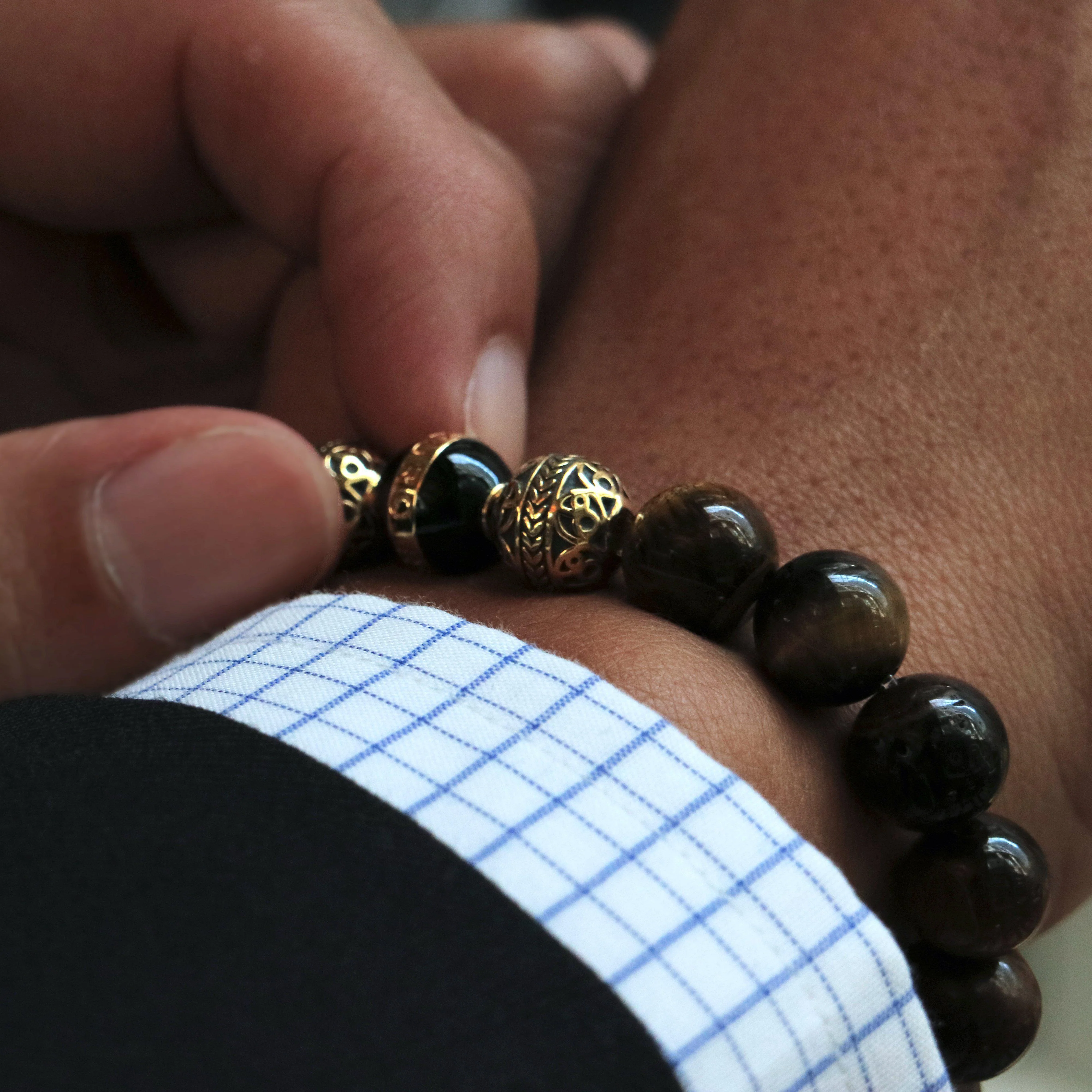Tiger eye beaded bracelets are one of theĀ most iconic designs of Azuro. Adding 24k gold and black enamel glass makes it unique on its own.Ā The gold tiger eye bracelet is one of the most loved designs of the founder of Azuro Republic.