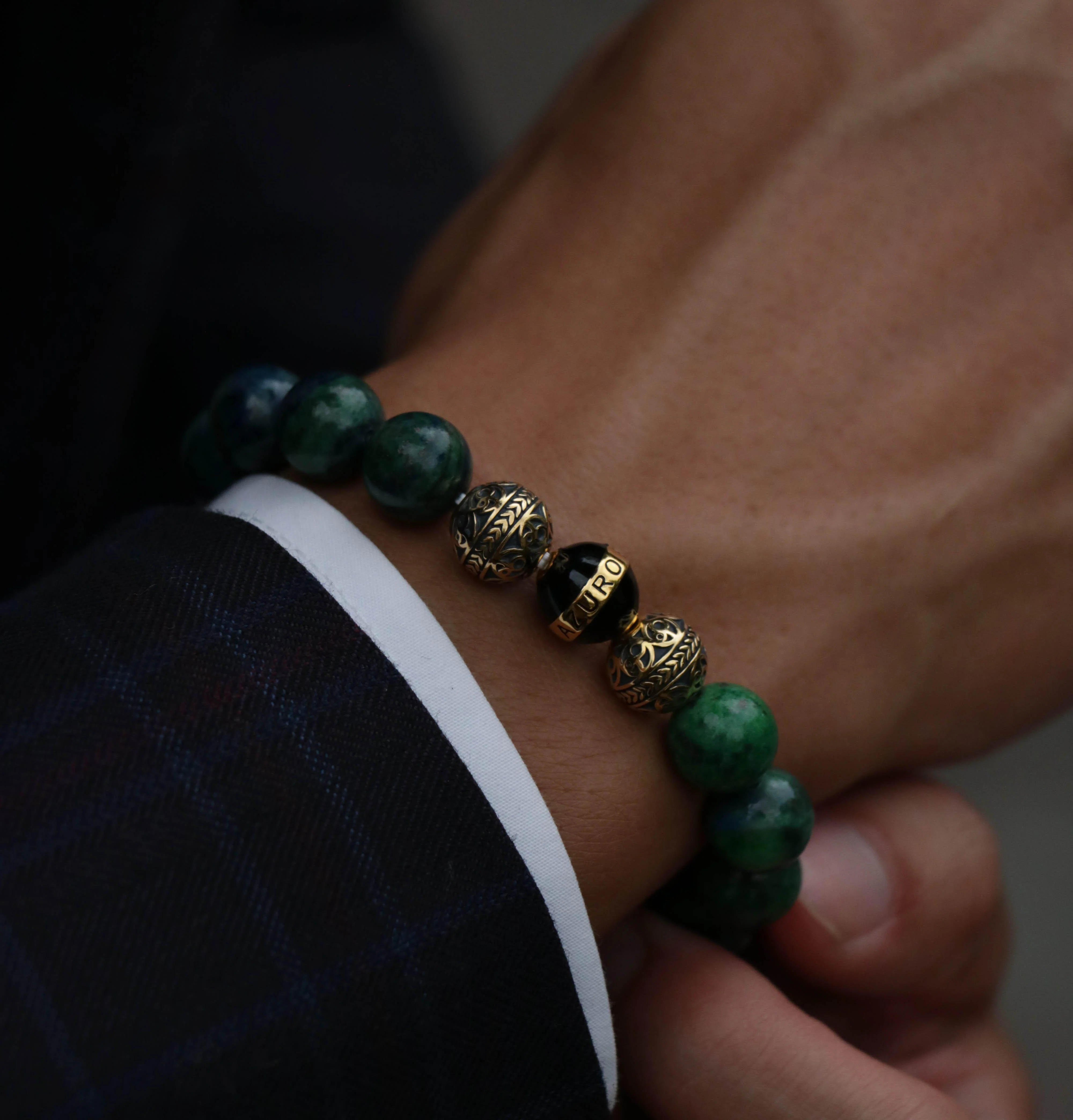 With its deep pigment, the energy of black azurite closely resonates with the chakra. Although not traditionally, it is the men's beaded bracelet to have for those born under Capricorn and Taurus, as this black azurite stone beaded bracelet as self-control of their often fiery tempers is provided. The gold enamel adds a subtle layer to this beaded bracelet design.