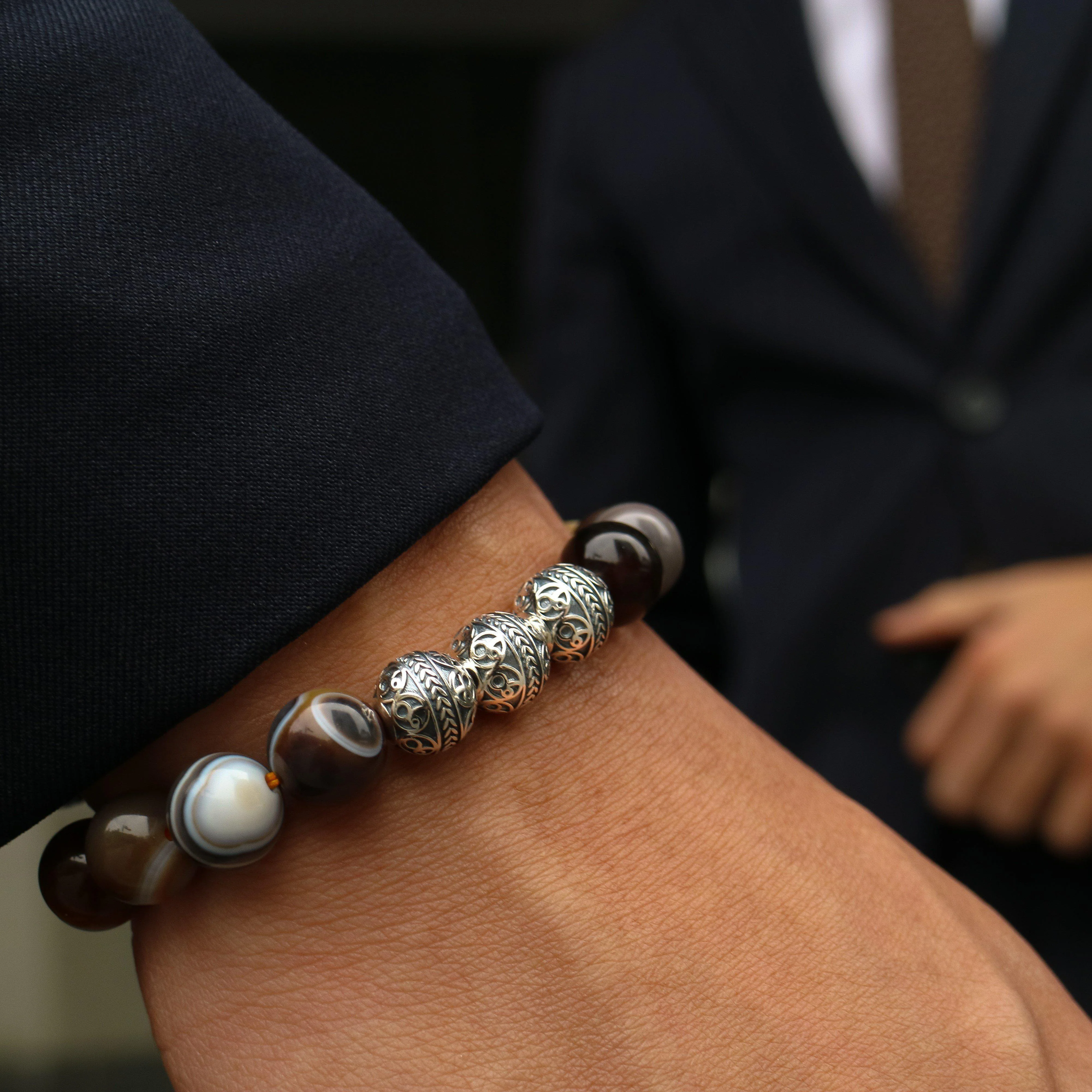 When you want something with a touch of classy, this silver brown agate bracelet is the one. Wear it with clothes that are simple yet sophisticated and let it speak for itself each time it shines from under your cuffs.The Agate Stone is variety of Chalcedony, a natural form of silicion dioxide. The Agate Stone is an excellent stone for rebalancing and harmonising body, mind and spirit. The Silver Dragorse Brown Agate Bracelet soothes and calms, heals inner anger or tension and creates a sense of security and safety. This brown agate bracelet promotes quiet introspection and reflection, providing growth and supportive energy. An Agate Stone bracelet is a bead bracelet for men that you can never not own. Match it with your favorite suit and it will match you and your spirit.